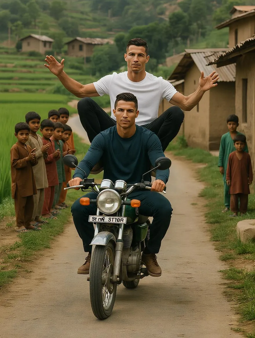 “Cristiano Ronaldo is already sitting on a motorbike parked on a narrow road in a Pakistani village. At the same time, Lionel Messi is lifting his leg to climb onto the bike and is in the process of sitting behind Ronaldo. The moment shows natural motion as Messi gets on the bike while Ronaldo waits calmly. The background has green fields, mud houses, and village children watching with excitement. The atmosphere is cinematic, colorful, and realistic.”