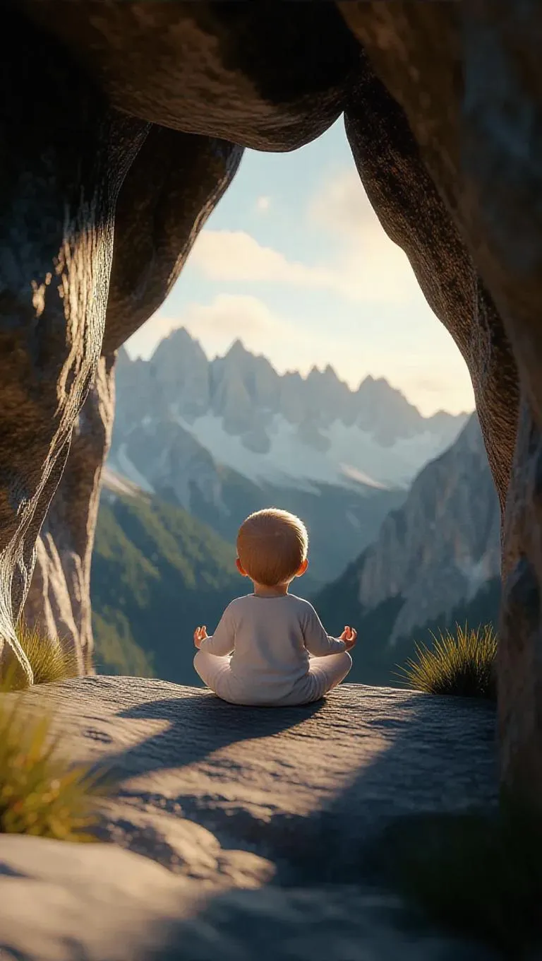 Generate a serene 3D AI image of a meditating baby sitting small on a mountain cliff. Features a vast sky backdrop, soft daylight, and natural tones in a vertical 9:16 format. Create this peaceful scene instantly with Vivago.ai's advanced AI image generator.