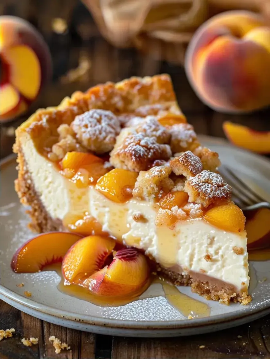 Create mouthwatering Peach Cobbler Cheesecake visuals with AI. Generate decadent layered dessert images blending buttery crust, creamy cheesecake, and caramelized peaches using text prompts. Explore AI effects for professional food photography results on vivago.ai.