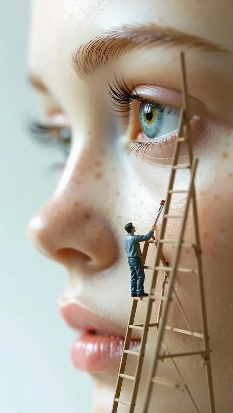 Surreal AI-generated art depicts a miniature painter detailing a giant freckled face's eye atop a ladder. Explore scale contrast, artistry, and perception in this vivid scene. Vivago.ai transforms prompts into striking visuals, challenging notions of size and detail with AI-powered tools for professional, imaginative creations.