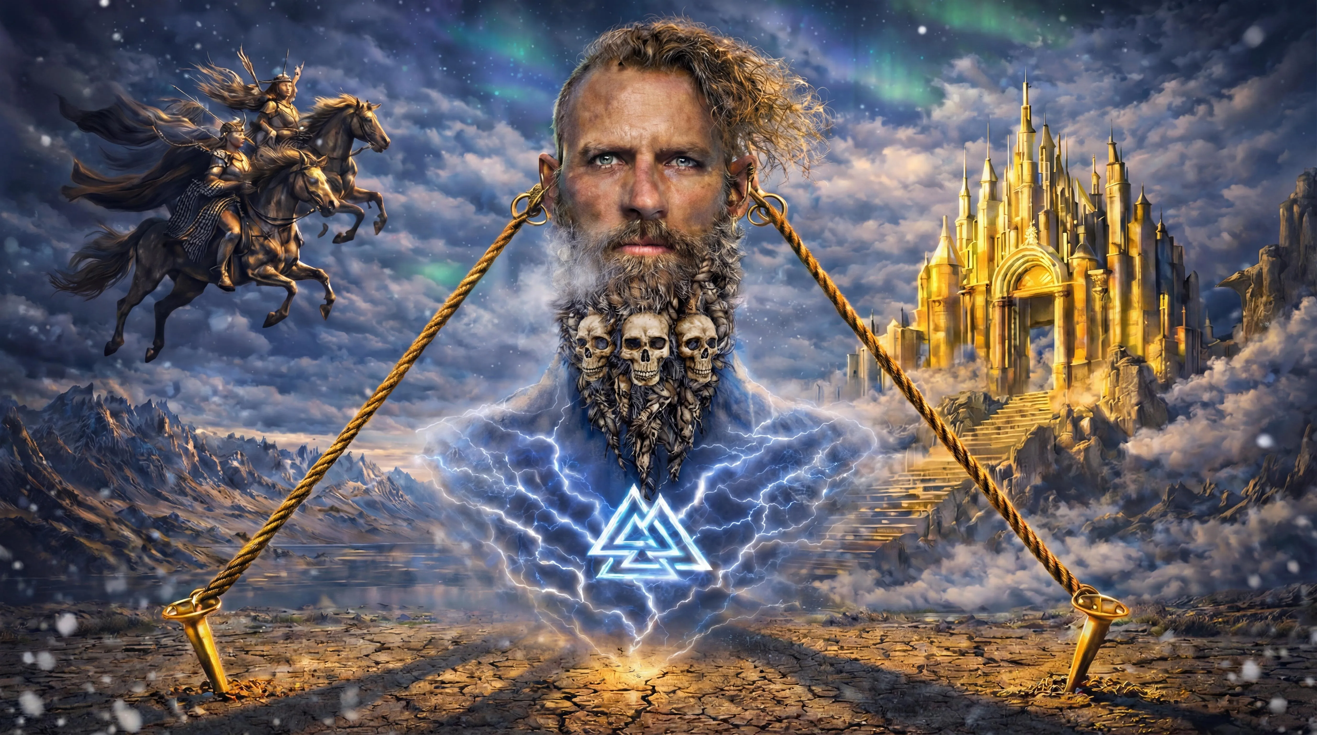 Generate an exact 4K cinematic replica of a surreal Nordic mythic scene featuring a suspended head, Odin's Valknut rune, Valhalla gates, and Valkyries. Strictly preserves composition, character identity, photorealistic details, and the 60:30:10 gold/blue/metallic color rule. Enhances micro-details for photorealism. No reinterpretation—Dali-influenced structural geometry with Nordic realism.