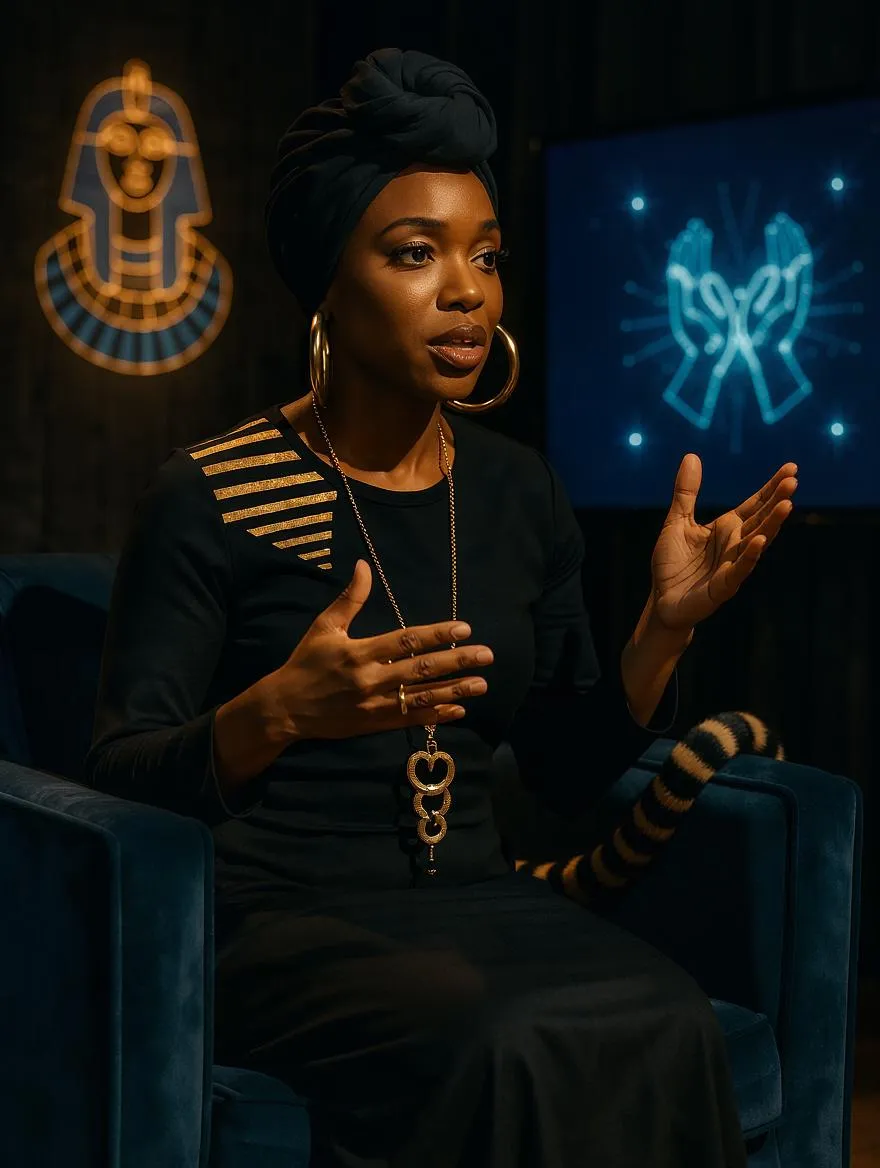 Craft Haitian witch broadcast visuals with AI: Zebra's mystical studio features amber-lit holograms of Cleopatra and veve symbols, ethical consent graphics, plus animated protection sigils. Generate cultural fusion scenes blending technology, headwrap/harper identity, and ancient serpents-heart amulets using professional AI image/video tools. (39 words)