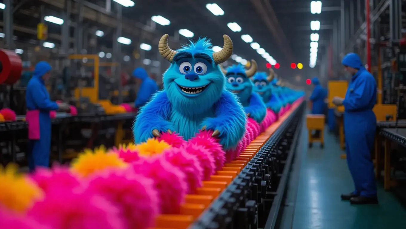 Witness Monsters Inc. fluffy toys come alive on a factory conveyor belt with AI-generated visuals. Vivago.ai crafts playful, professional-grade scenes from text prompts, blending whimsical creativity and advanced AI effects for eye-catching video/image content. Perfect for bringing imaginative concepts to life seamlessly.