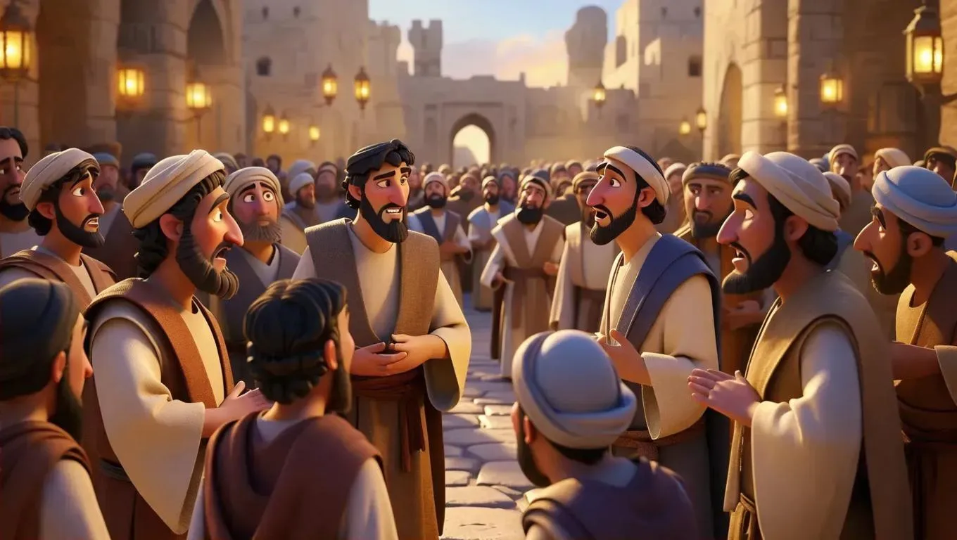 Generate realistic 3D Pixar-style animations of Biblical Pharisees engaging in deceitful dialogues with crowds in public squares using AI. Create lifelike character expressions and dynamic crowd scenes for immersive historical storytelling. Perfect for religious education or creative projects with vivago.ai's AI image generator.