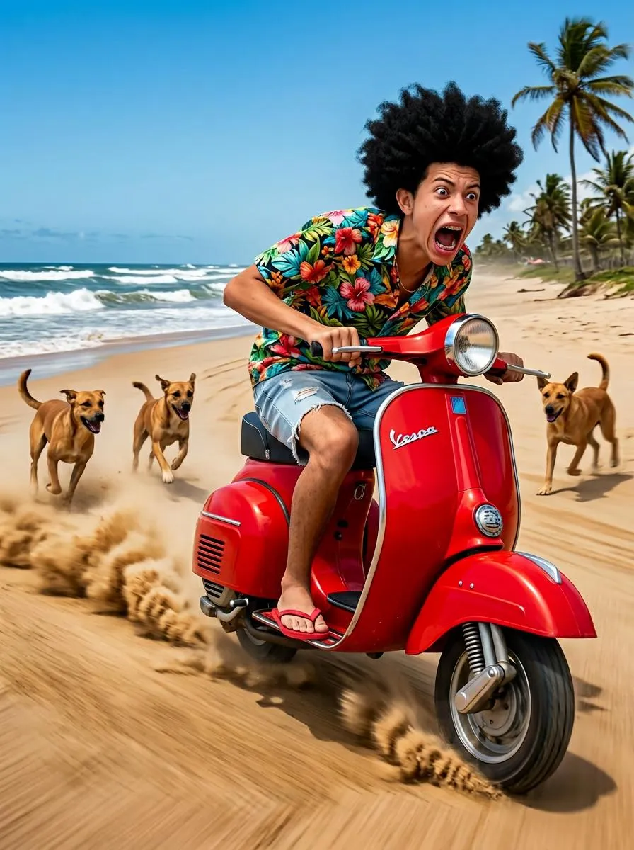 Generate a precise photorealistic AI image of a young rider escaping on a red Vespa. Keep exact facial features, gender, and age from your photo. Features thick black afro, tropical shirt, denim shorts, three dogs chasing on a coastal highway with crashing waves, palm trees. Capture motion blur, panic, cinematic chaos, 8K ultra-details. VivaGo AI: Upload-to-image tool for pro results.