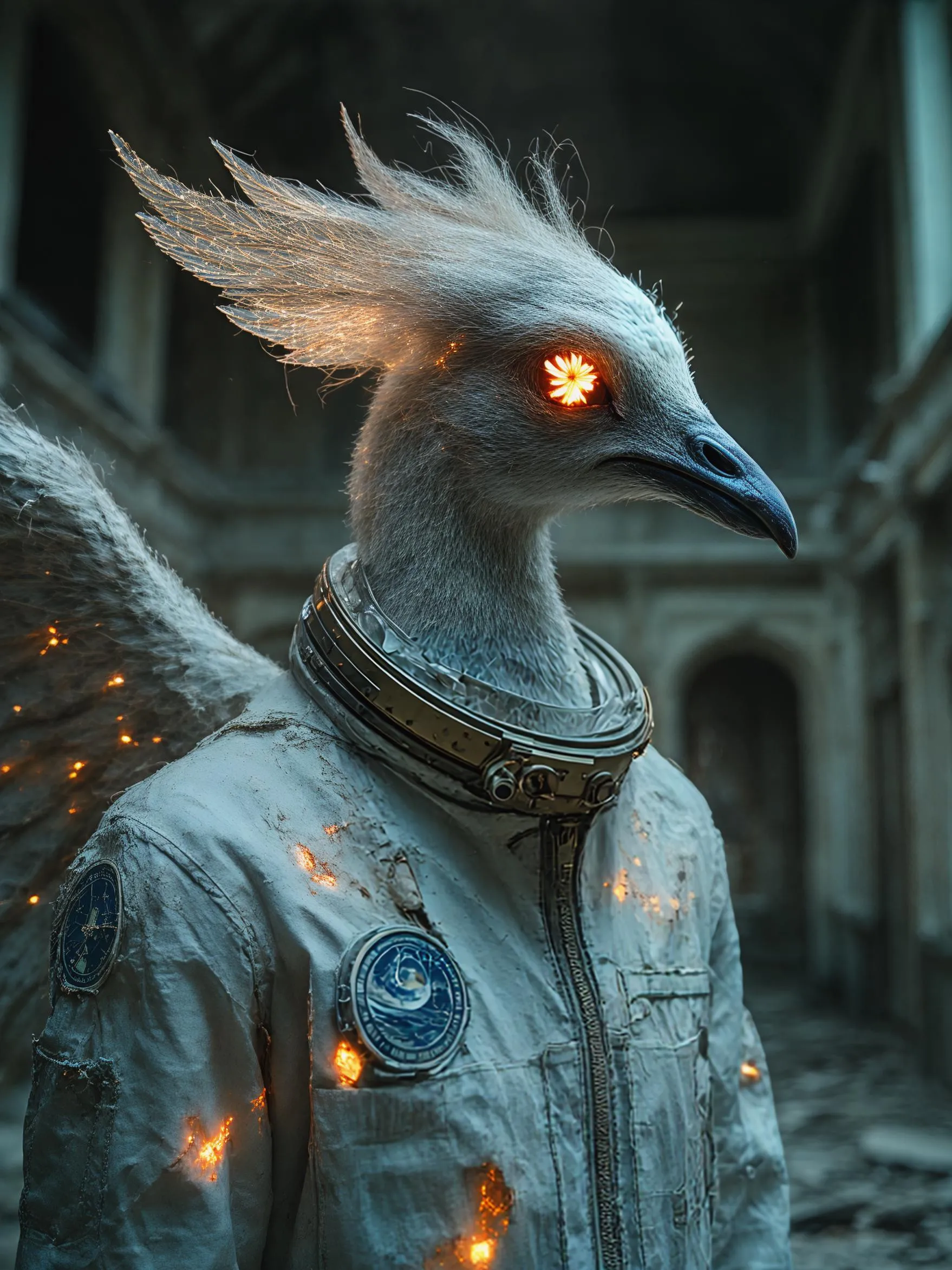 Generate stunning AI art of a Pegasus with binary code gender, glowing embers, and flower-shaped pupils as a sulking astronaut commander. This surreal photograph features an abandoned asylum setting, tattered lab coat, alpha map transparency showing mutations, and chiaroscuro lighting. Capture high-fashion scientific ambition turning unsettling. Explore with Vivago.ai.