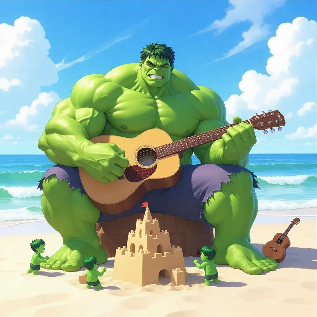 The Hulk, a towering green giant with a cheerful expression and smile, sits on a quiet beach playing his guitar. His muscles are relaxed and his eyes convey a sense of joy. The Hulk's little green children are building a sand castle, adding to the serenity of the scene. The quiet small calm waves of the sea give an atmosphere of peace. The sky above him is a clear blue, with lazily floating fluffy white clouds. Soft, warm sunlight filters through, casting soft shadows and highlighting the Hulk's green skin and the vibrant landscape. The style is realistic, with a touch of whimsical fantasy.