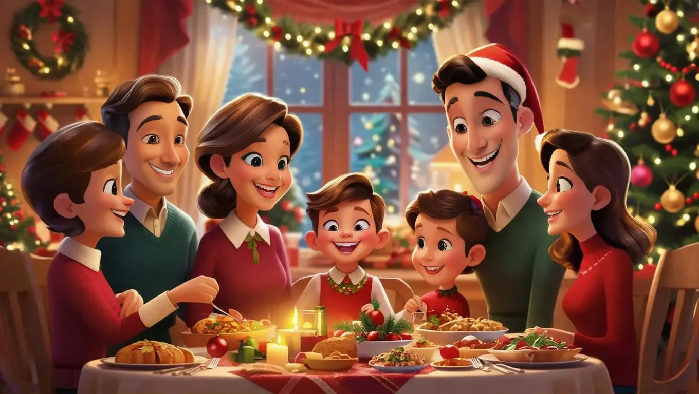 Generate vibrant cartoon-style Christmas family dinner scenes with AI. This festive image depicts joyful togetherness, warm interactions, and holiday cheer through playful animations. Ideal for greeting cards, social media, or festive content. vivago.ai’s tools transform prompts into lively, heartwarming visuals perfect for capturing magical holiday moments.
