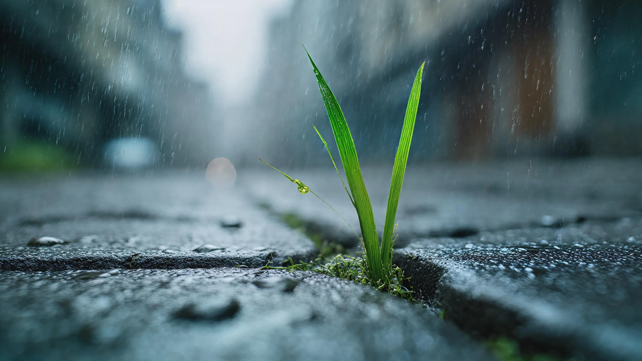 Create realistic AI images of resilient green grass sprouting through gray pavement in heavy rain. Transform text prompts into inspiring visuals with vivago.ai's powerful image generator. Perfect for nature resilience themes and urban photography concepts.