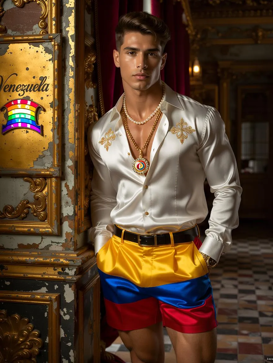 Create AI art of a Venezuelan-inspired portrait: a muscular young man wearing patriotic shorts and baroque jewelry in a decaying hallway. Features vivid rainbow light leaks, Rembrandt-style lighting, and sharp details for dramatic, high-fashion photography. Use AI to generate this rich, textured image with a dreamlike mood.