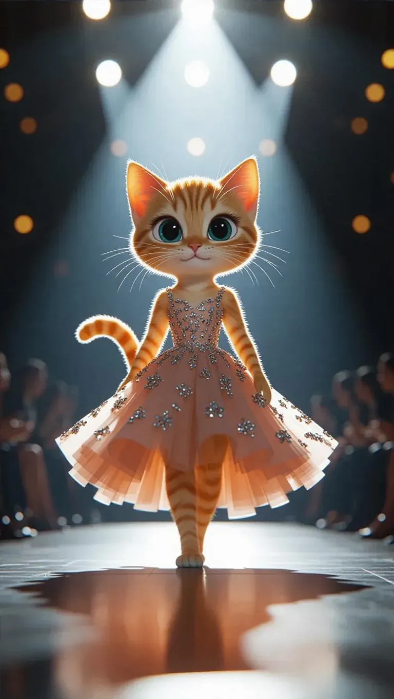 Create an AI-generated fashion masterpiece featuring an anthropomorphic orange kitten in a bespoke high-fashion gown, strutting confidently on a runway. Experience Pixar-style CGI with cinematic lighting, soft color palettes, and 8K ultra-high resolution. Perfect for surreal wallpapers or photorealistic fashion photography powered by AI tools for depth of field and Unreal Engine-quality details.