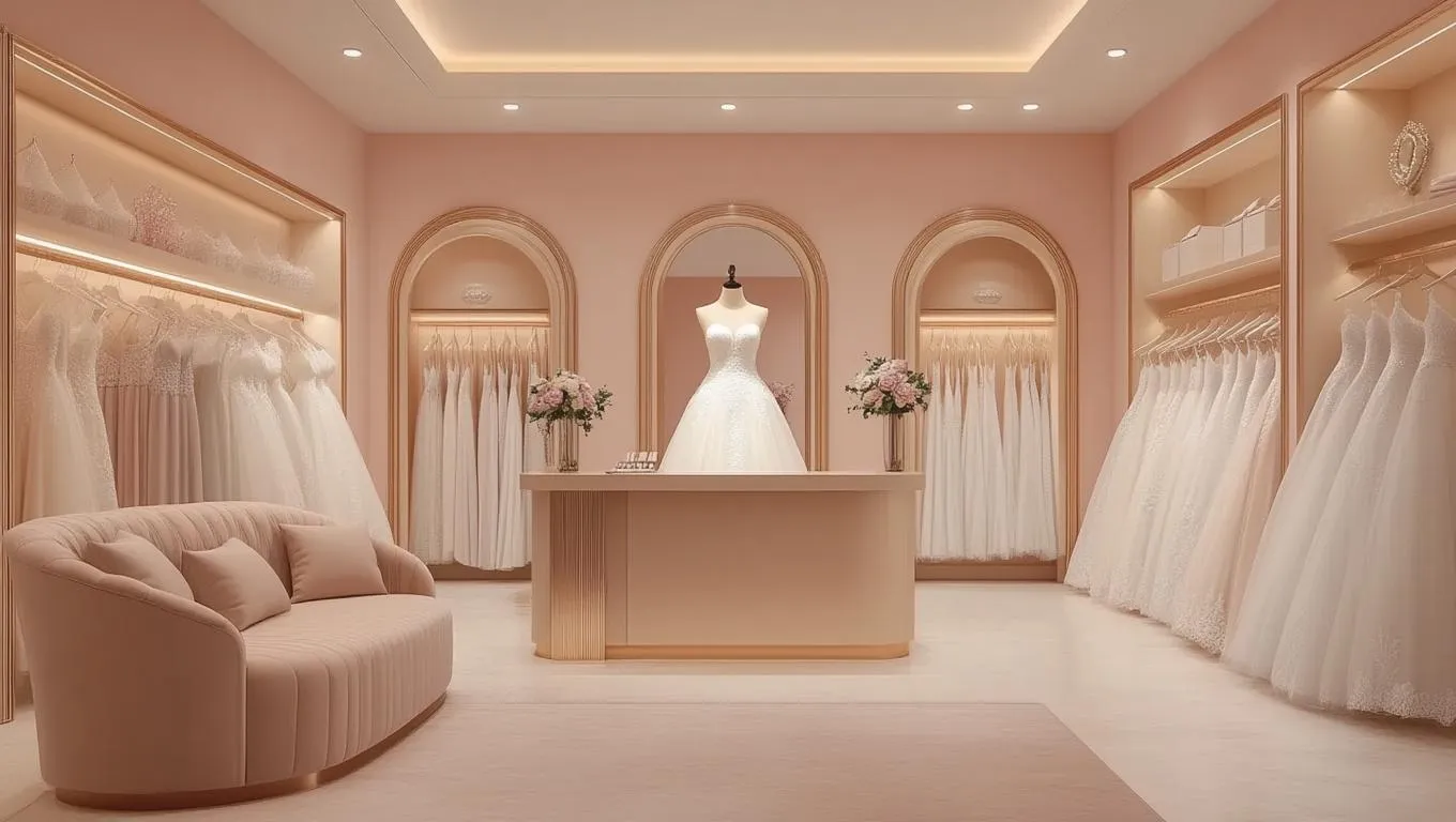 Generate a photo-realistic bridal boutique layout with AI: stylish reception, elegant gown displays, accessories section, mirrored fitting rooms, and organized storage. Features soft pastel walls, warm lighting, luxurious furnishings, and polished floors for a premium wedding shop atmosphere. Perfect AI-powered interior visualization for bridal wear businesses.