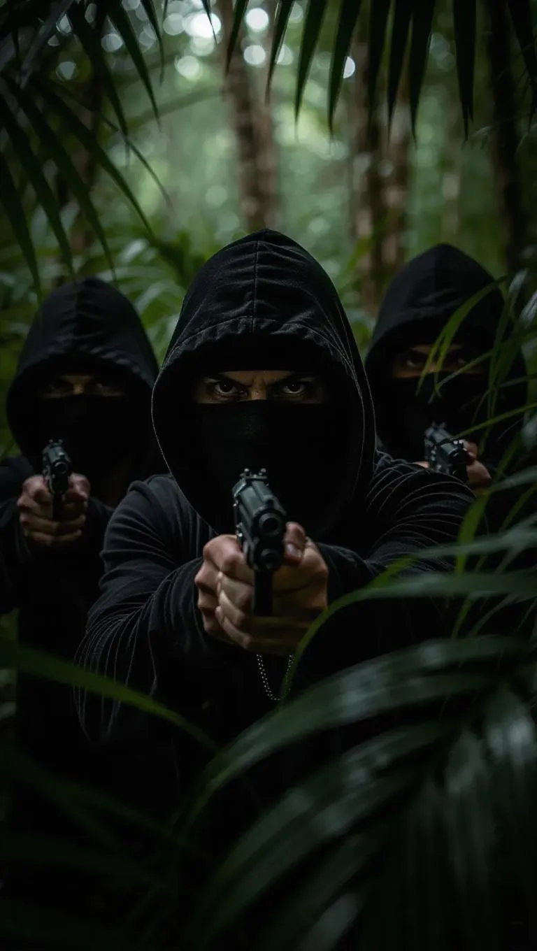 Three masked men emerging from dense jungle shadows, weapons in hand, adopting menacing postures, eyes piercing through the foliage, tension palpable in the air, creating a sense of impending danger and suspense.