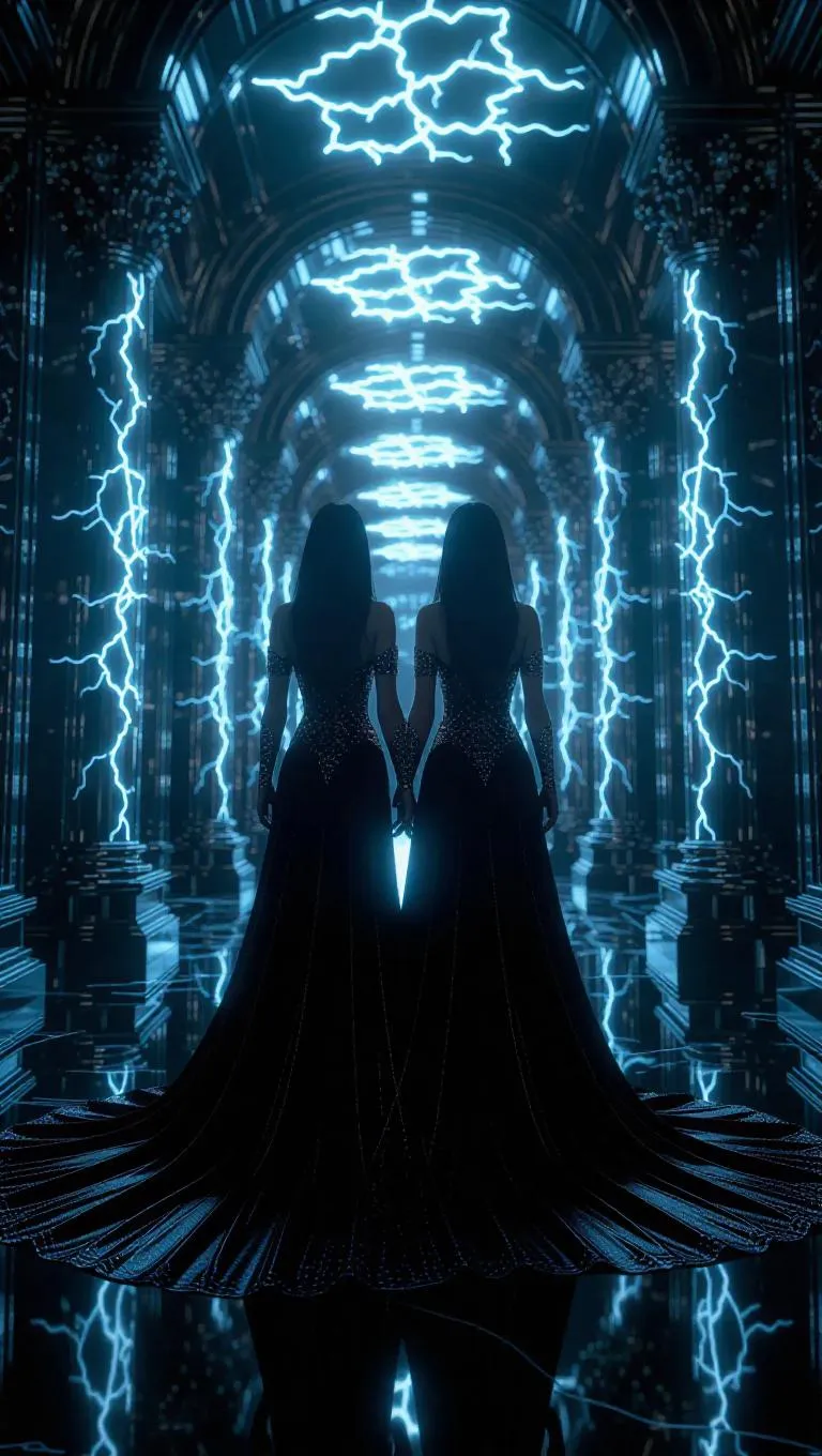 A majestic fantasy realm crafted from shimmering mirrors and electric lightning storms, where old and young versions of the same regal queen stand side by side, adorned in opulent, flowing garments. The 3D setting is a labyrinth of reflective surfaces and ethereal light, creating a surreal and enchanting atmosphere.