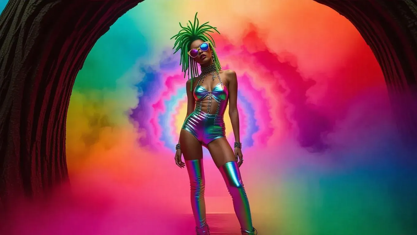 Ultra-realistic AI-generated fashion image of a bold Weirdo Wizo model in neon-green dreadlocks, metallic corset, and iridescent tights. Avant-garde magazine cover concept with surreal tree-trunk catwalk, swirling rainbow fog, and shallow depth of field. Hyper-stylized, eccentric AI art blending vibrant textures and dynamic angles for eye-catching editorial or avant-garde fashion branding.