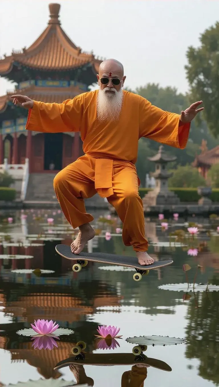 A Buddha in trendy sunglasses executing a flawless mid-air kickflip on a skateboard, soaring above a tranquil lotus pond, with an ancient temple in the background, capturing a perfect blend of serenity and dynamic motion.