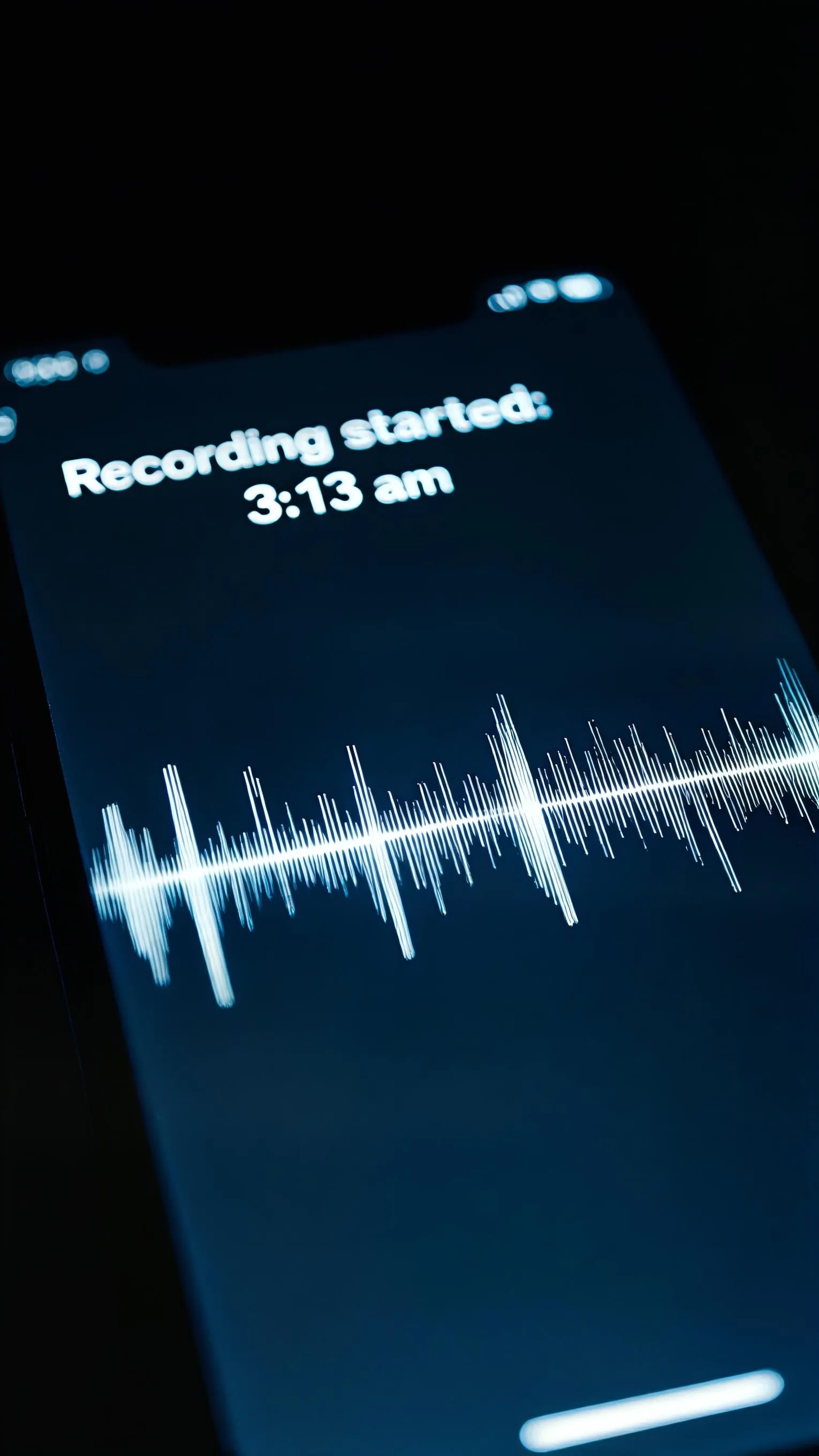 Capture intense quiet tension with this AI-generated scene: a phone screen lights up at 3:13 AM in darkness, displaying "Recording Started." Soft breathing audio visualized as waveform, noir-blue tones. Macro low-light shot with 50mm lens enhances suspense. Create this atmospheric visual using vivago.ai's cinematic AI tools.