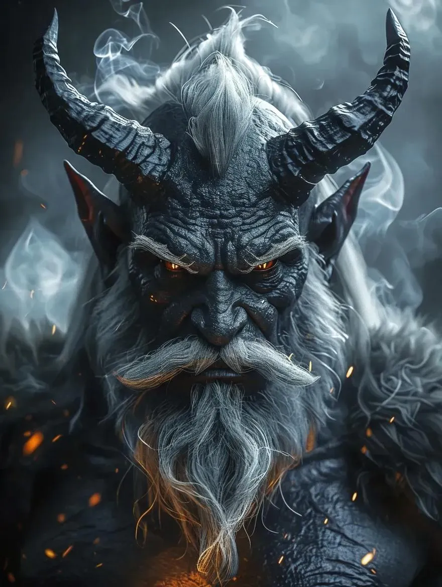 Generate a chubby horned devil character with AI—balding, gray hair, chest hair, flaccid potbelly. Use vivago.ai's AI image generator and effects for hyper-detailed, customizable fantasy designs. Ideal for artists, creators, and storytellers seeking unique, professional-grade mythical visuals.