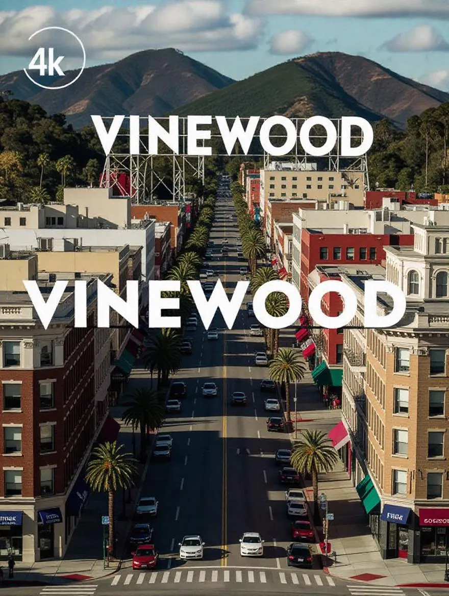 Generate a stunning 4K HD bird's eye view of a city featuring the iconic VINEWOOD sign atop hills. Capture buildings, streets, cars, and palm trees with vivago.ai's AI image generator for professional-grade aerial visuals from text prompts.