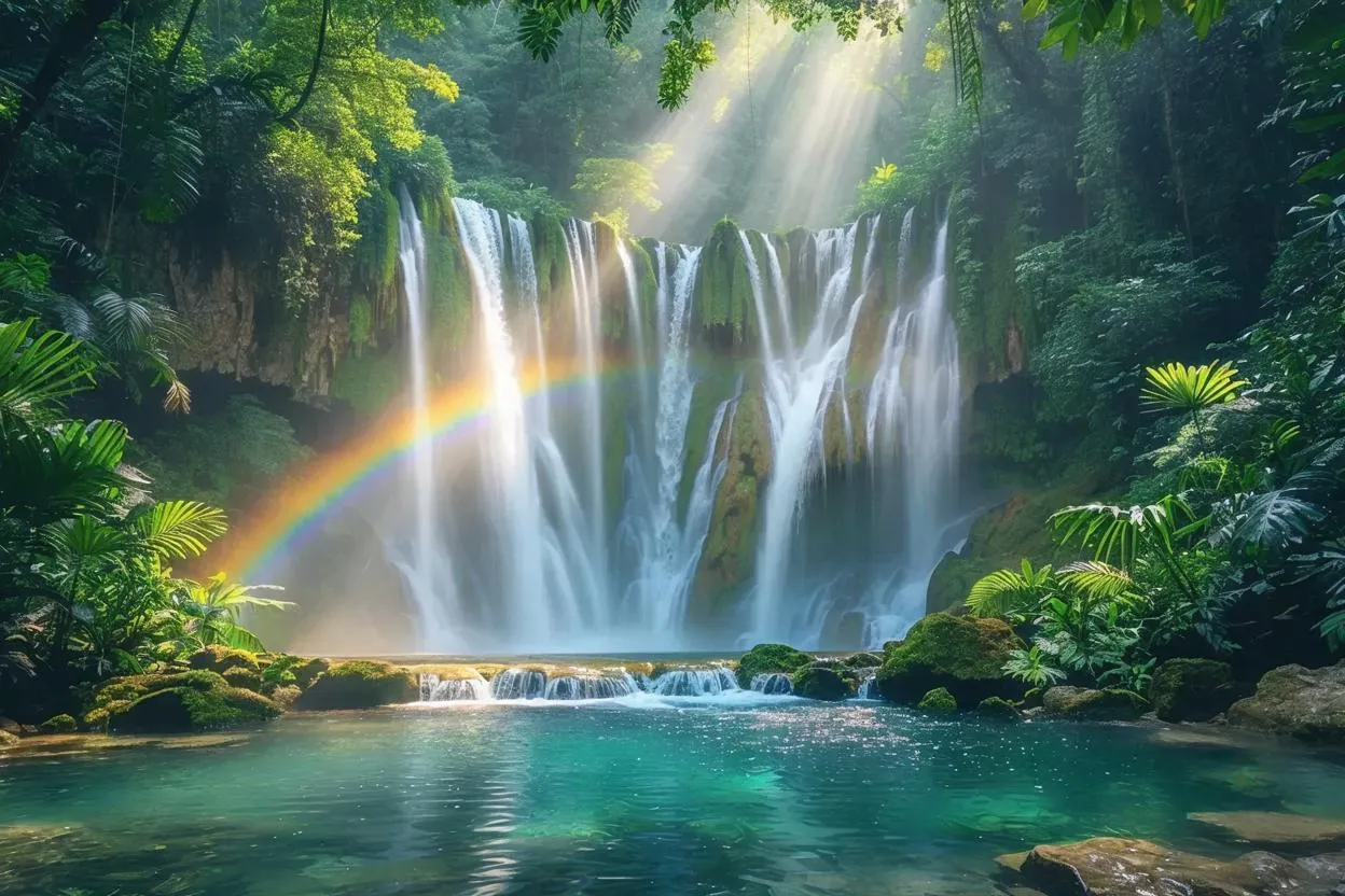 Generate a stunning AI tropical waterfall scene with cascading waters amidst lush jungle foliage. Vibrant greenery surrounds a crystal-clear pool, sunlight piercing through dense canopies to create rainbow mist reflections. Craft exotic jungle paradises effortlessly using vivago.ai's AI image generator for professional-grade nature visuals from text prompts.