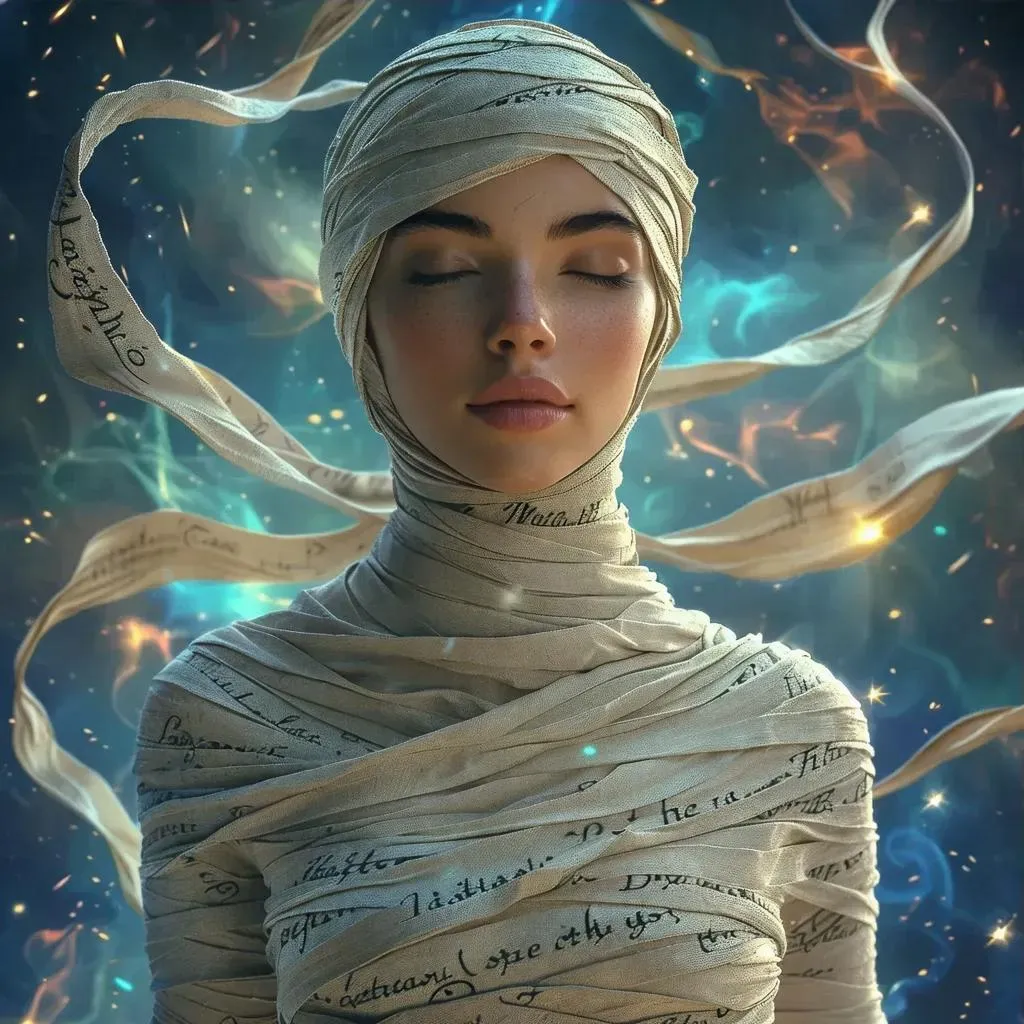 Generate a captivating fantasy AI image of a curvaceous woman adorned in mystical word bands, floating ethereally amidst vibrant, unstructured hues. Dark lighting accentuates her alluring form, eyes closed, hair flowing, viewed from below for dramatic effect. Perfect for enchanting visual storytelling with Vivago.ai's advanced AI art tools.