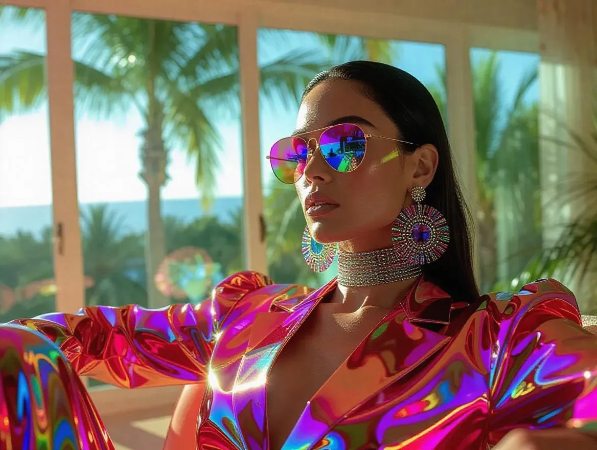 Step into a vibrant 1980s living room with AI-generated visuals: palm views through large windows, iridescent sunglasses, bold earrings, and sensual retro decor. Experience nostalgic daylight photography blending retro realism with vivid color play. Create striking 1980s interiors and iridescent fashion using VivaGo AI's advanced image tools for dynamic, era-inspired designs.