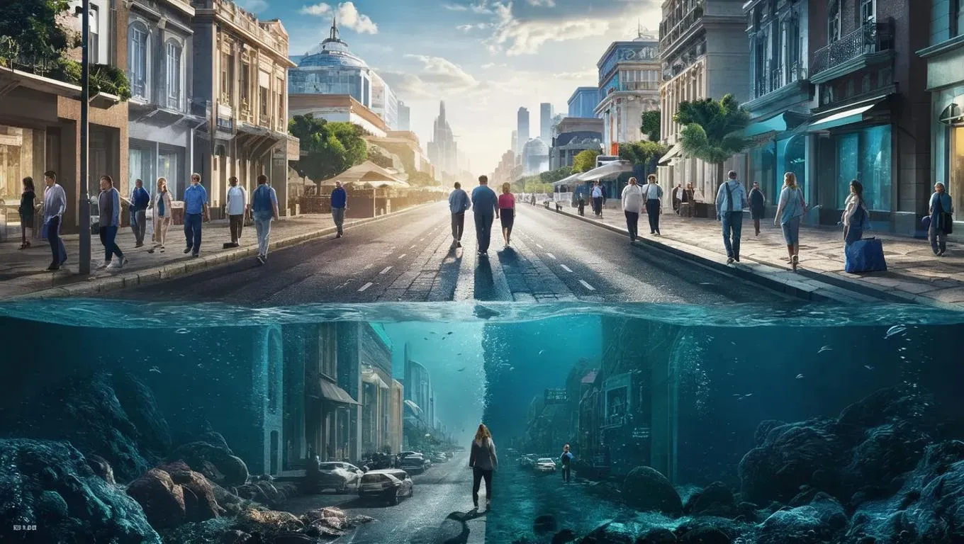 Create a striking AI-generated image with Vivago.ai, contrasting a serene street scene aboveground and a hidden modern Atlantis below. Seamlessly blend everyday life with futuristic underwater marvels using advanced AI tools for vivid visual divides, professional-grade transformations, and imaginative cityscape contrasts. Ideal for surreal, hyper-realistic art and dynamic visual storytelling.