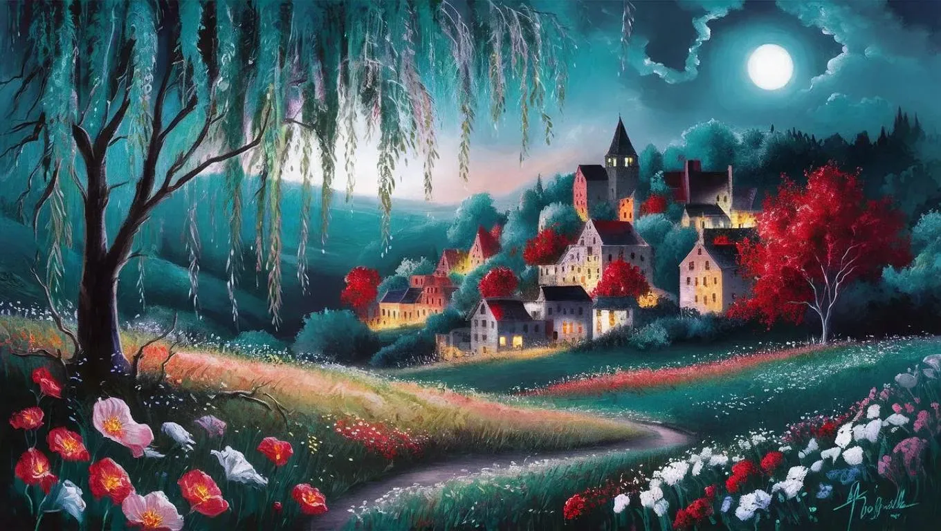 Create a dreamy pastel drawing inspired by Rosso Emerald Crimson with AI. Generate vibrant meadows, weeping willows, and glowing village silhouettes in turquoise, red, and cool blue hues. Perfect for whimsical landscapes, ethereal art, and colorful AI effects. Transform prompts into luminous, professional-grade visuals effortlessly.