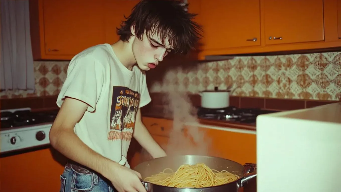 AI-generated 1970s kitchen scene: rebellious punk rocker cooks spaghetti in ripped jeans, surrounded by retro orange appliances, patterned wallpaper, and Polaroid-style warmth. Vintage AI art with faded colors, blurry textures, and a cheeky vibe—perfect for edgy retro visuals, nostalgic cooking moments, or rebellious character designs.