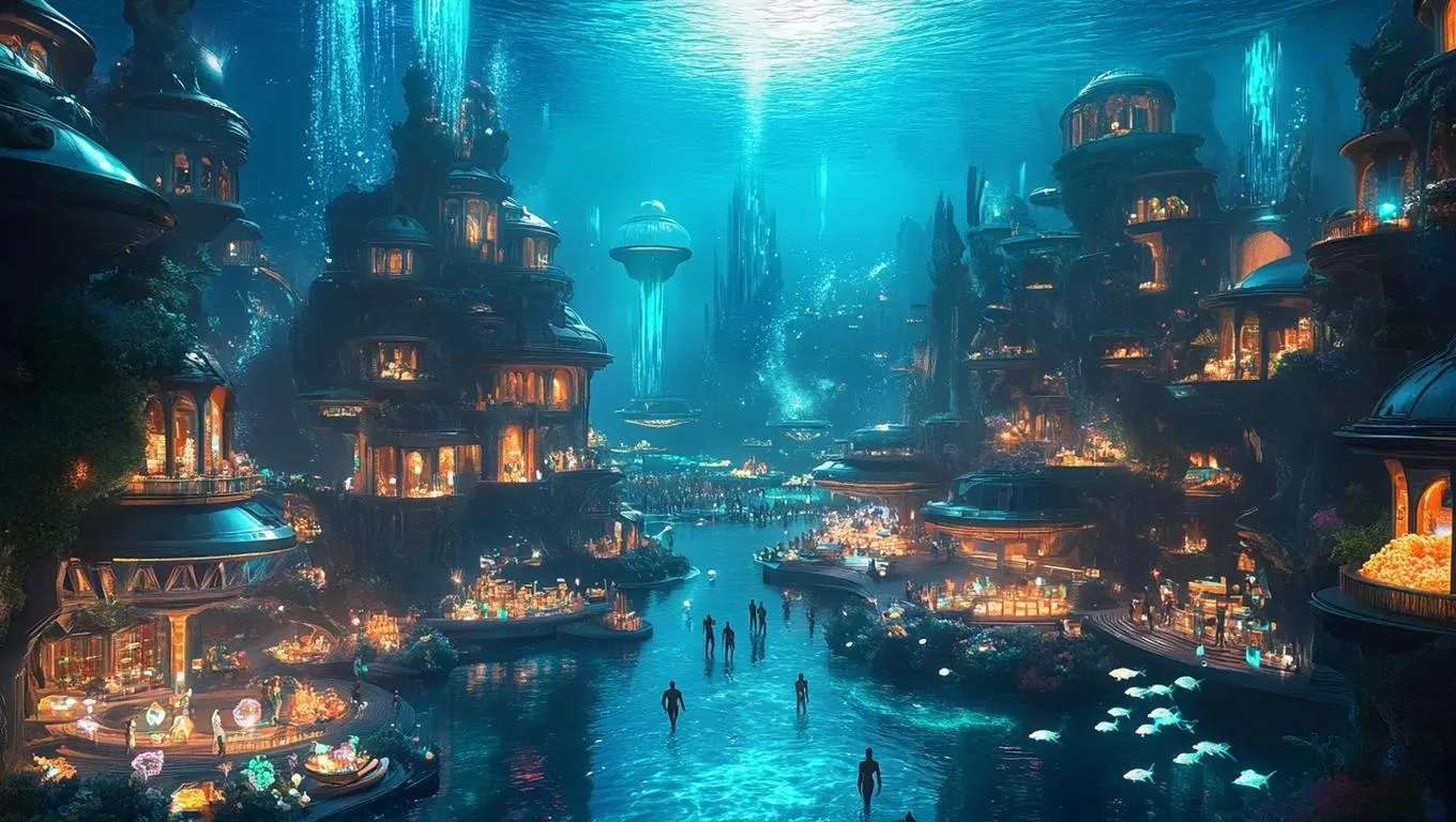 Experience breathtaking AI-generated visuals of a vibrant underwater metropolis awakening at dawn. Witness Atlanteans gliding through prismatic light displays, trading glowing pearls, sculpting living coral architecture, and studying neon fish schools. Cinematic slow-motion captures hydrokinetic gestures, floating lanterns, and pulsing aquatic gardens in crystal-clear waters. Elevate creative projects with AI-powered cinematic scenes and liquid-light patterns.