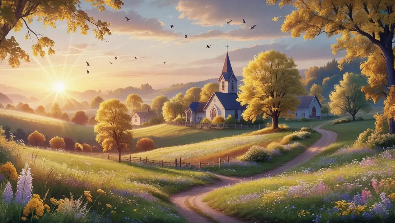 Experience a serene countryside sunrise with golden hues, vibrant fall foliage, and wildflowers. AI-generated imagery captures distant village charm, church steeples, and tranquil mornings alive with birdsong. Create your idyllic rural haven using Vivago.ai's tools for stunning, professional-grade visuals from text prompts or reference images. Perfect for enchanting landscapes and nature-inspired art.