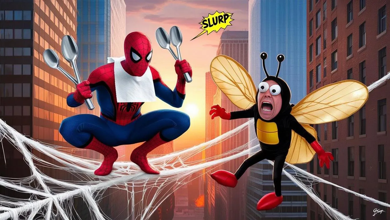 Spiderman crouches dynamically on a glistening spiderweb stretching between skyscrapers, wearing a napkin bib and gripping oversized silver cutlery with a mock-ferocious grin. Below, a panicked man in a comically bulbous fly costume with oversized wings and googly-eyed antennae struggles in the silk threads, his expression comically horrified. Golden hour lighting casts long shadows across the hybrid cityscape, blending hyper-realistic textures with comic-book halftone patterns. Red and yellow dominate the composition, with spaghetti-strand web details catching orange sunset reflections. A faint "SLURP" sound effect floats in the air through visual text elements.