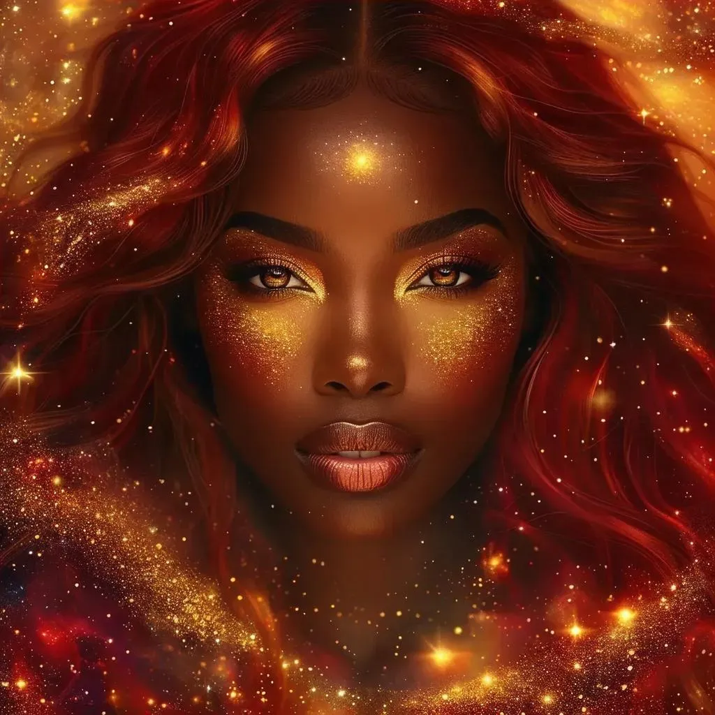 Create stunning AI-generated divine feminine art with a black woman featuring fiery red hair, glowing eyes, and solemn grace. Explore ethereal galaxy backgrounds in cinematic reds, gold hues, and spiritual goddess energy. Transform prompts into mystical visuals using vivago.ai's AI image tools for professional, otherworldly results.