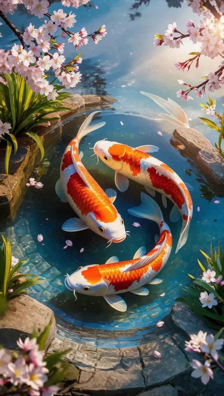 Capture vibrant koi fish gliding in a serene spring pond from an aerial view. Generate stunning AI visuals with vivid colors, tranquil waters, and blooming details—perfect for nature-inspired art, digital projects, or enhancing photography using advanced AI effects and text-to-image tools.