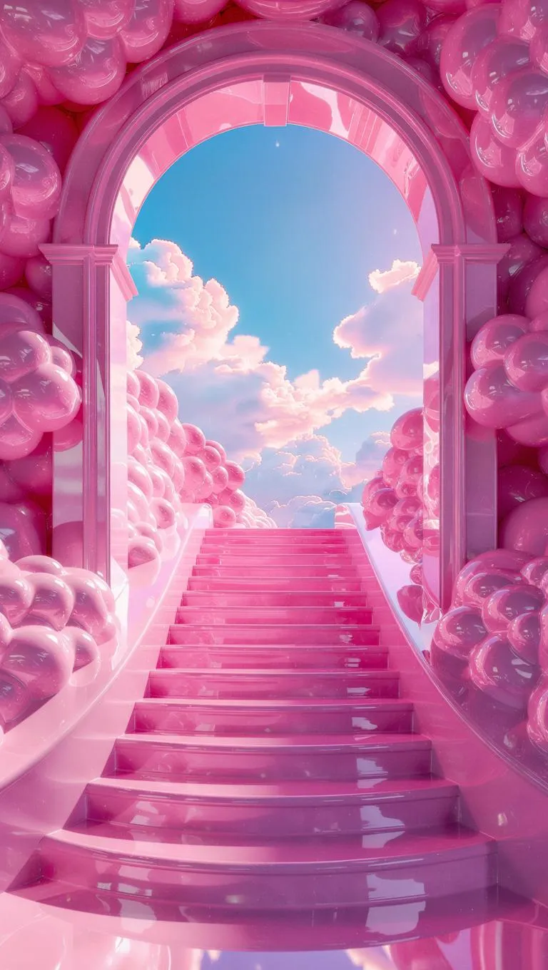 A hyper-detailed 3D render of a surreal vertical dreamscape (2000x2500), featuring glossy, molded plastic stairs ascending toward a rounded archway suspended in a toy-like pink dimension. Surrounding the path are hyper-shiny bubblegum clouds with a hard, synthetic sheen—evoking a fantasy world made entirely of sculpted vinyl and lacquer. The palette explodes with saturated candy pinks, accented by soft ambient light and smooth reflections. Through the archway, a pastel blue gradient sky frames stylized, puffy clouds like airbrushed candy. Every surface gleams with high-gloss polish, creating an artificial yet enchanting aesthetic—like a Barbie dream world reimagined through digital surrealism.