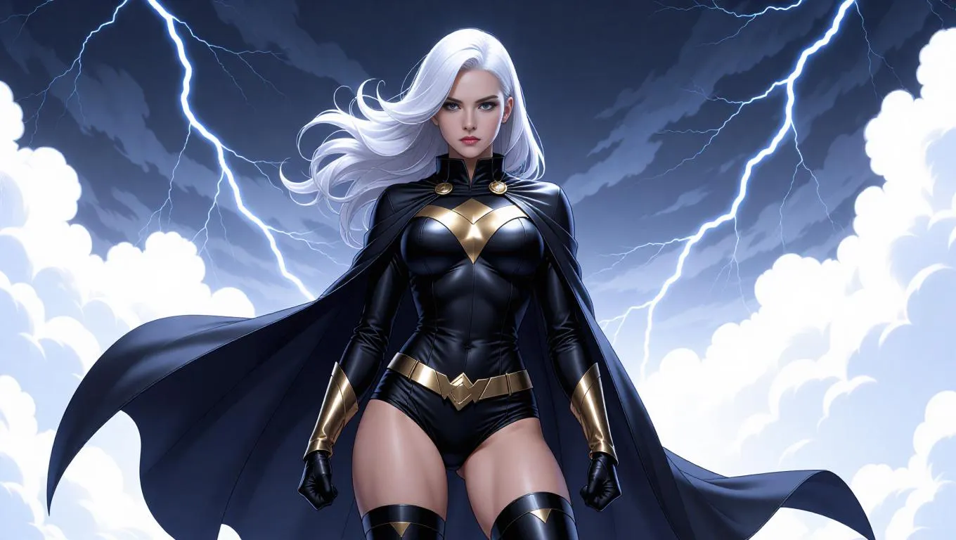 Create a fierce female superhero with AI-generated art. Vivago.ai crafts dynamic visuals of a dramatic heroine in a black-and-gold emblem outfit, flowing cape, and lightning-streaked skies. Perfect for striking digital illustrations, character design, and powerful storytelling with professional AI effects. Ideal for comics, posters, and bold creative projects.