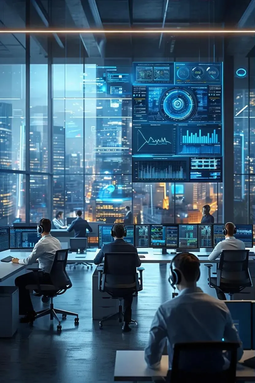 Explore AI-generated futuristic workspaces with vivago.ai. Transform prompts into dynamic office scenes featuring sleek tech, real-time analytics, and collaborative professionals. Perfect for showcasing innovative, AI-powered call centers and modern work environments with cutting-edge visual effects and professional-grade results.
