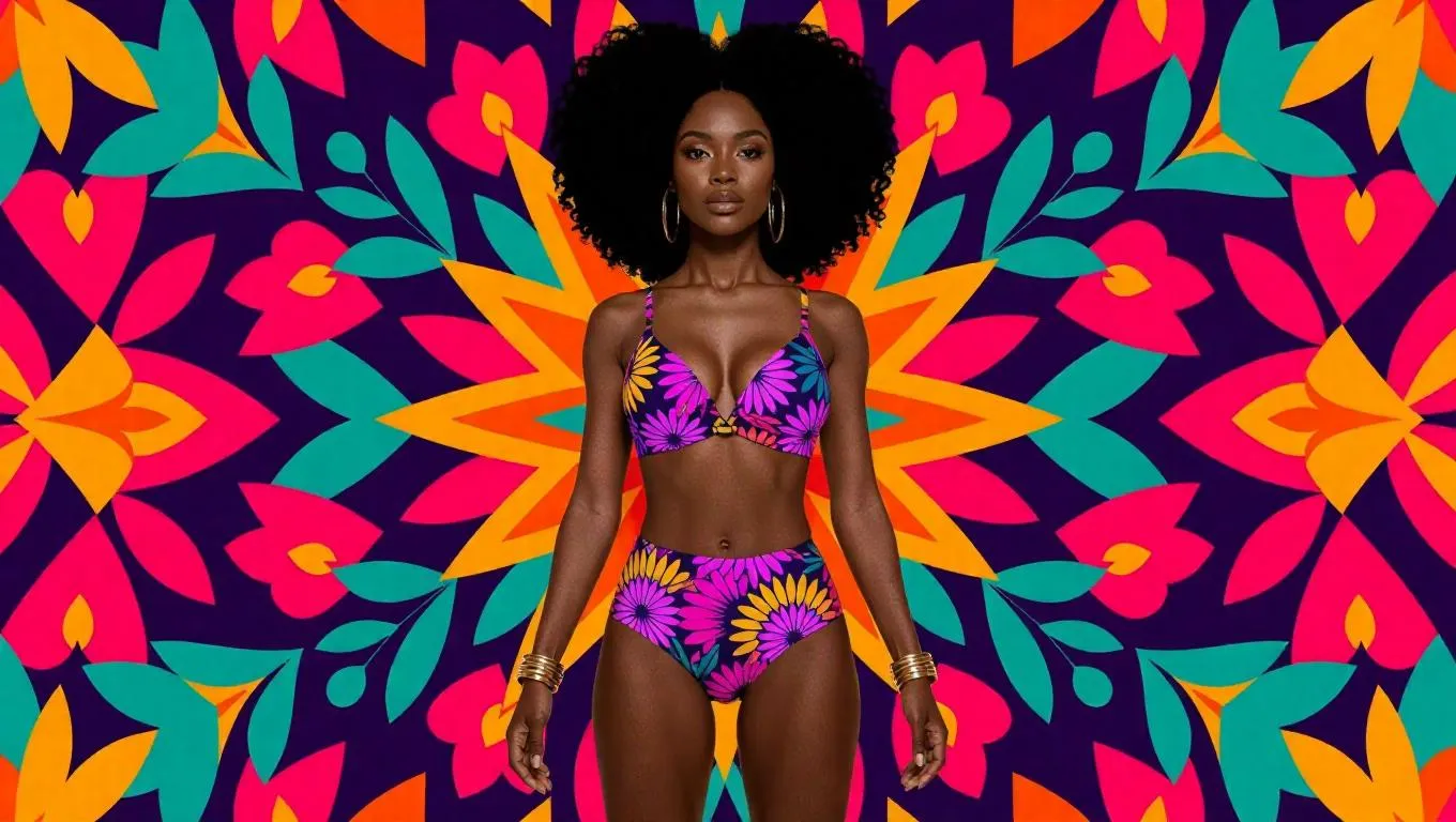 Digital illustration of a dark-skinned black woman, 27 years old, with voluminous curly hair, adorned in a vibrant loincloth. Set against a dynamic background featuring bold geometric shapes and intricate floral patterns, radiating a sense of cultural pride and modernity.