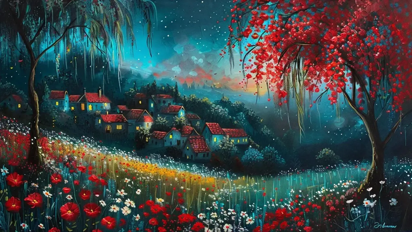 Create a dreamy pastel drawing inspired by Rosso Emerald Crimson with AI. Generate vibrant meadows, weeping willows, and glowing village silhouettes in turquoise, red, and cool blue hues. Perfect for whimsical landscapes, ethereal art, and colorful AI effects. Transform prompts into luminous, professional-grade visuals effortlessly.