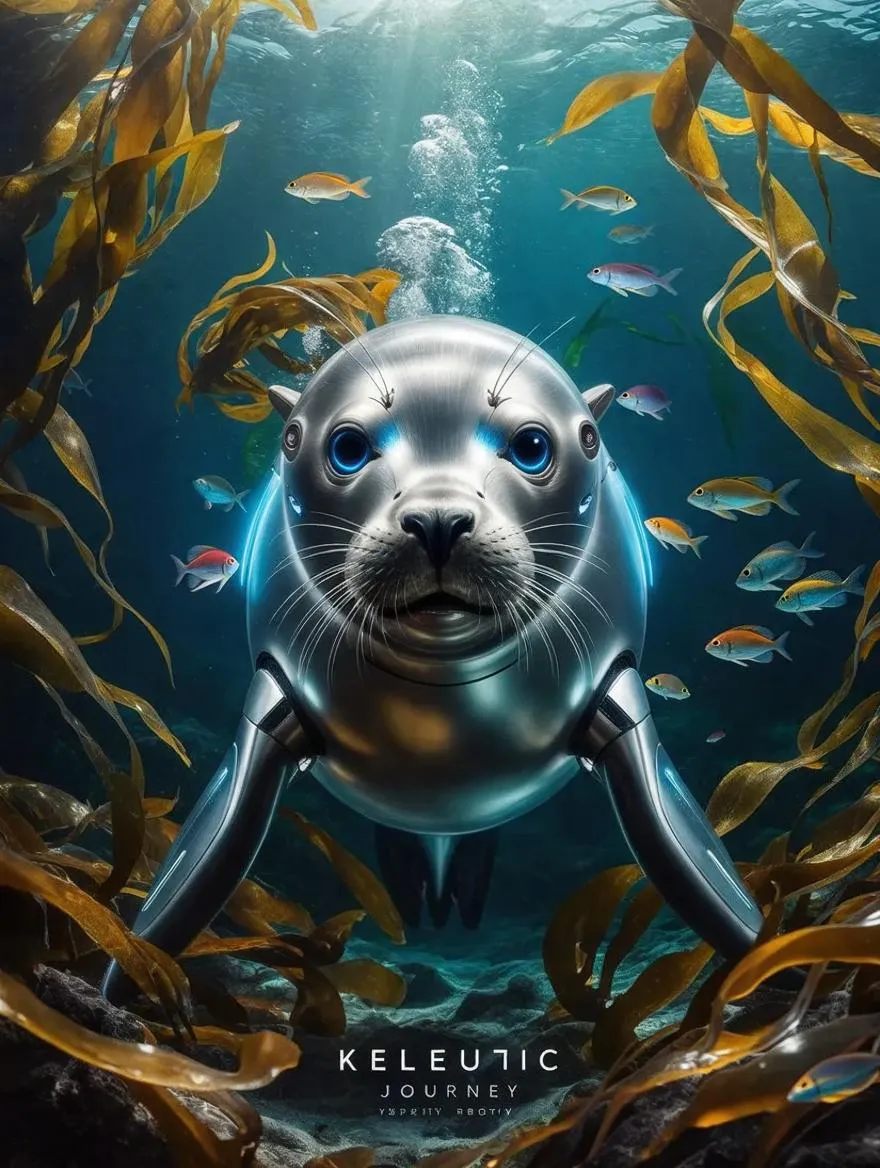 Generate AI visuals of a surreal underwater scene in a kelp forest featuring a cybernetic sea lion with a glowing blue robotic eye. Explore futuristic marine life imagery through AI-powered effects for striking, professional-grade video or photo content. Transform text prompts into vivid, imaginative aquatic worlds instantly.