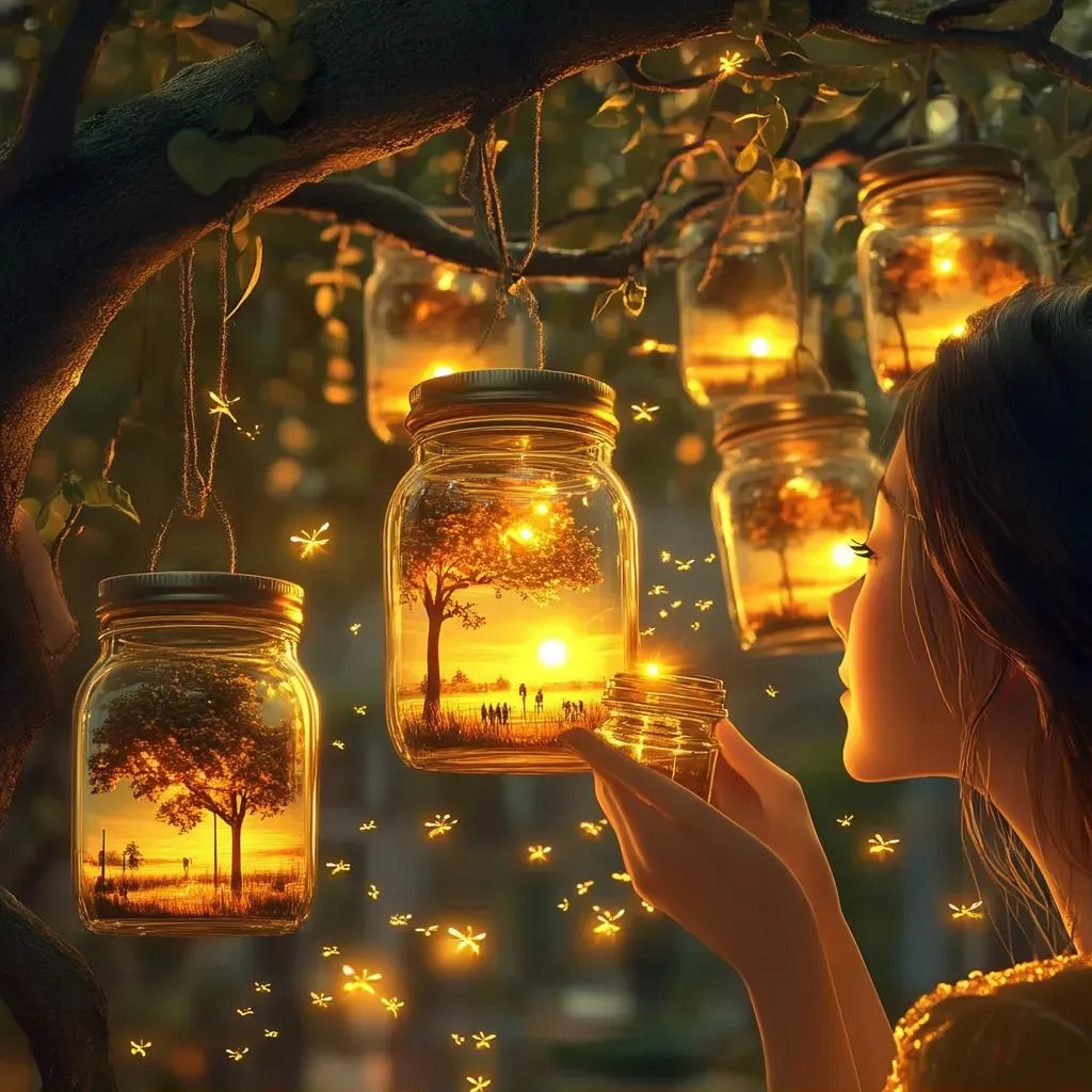 Discover AI-generated anime watercolor art blending cinematic magic. A traveler unlocks a glowing jar, releasing golden light and fireflies amid miniature sunset scenes. Close-up lens flare highlights this ethereal watercolor moment. Create dreamy, cinematic visuals with Vivago.ai's AI image generation tools for anime-style, artistic storytelling in 1:1 aspect ratio. Perfect for fantasy scenes, ethereal effects, and whimsical storytelling.