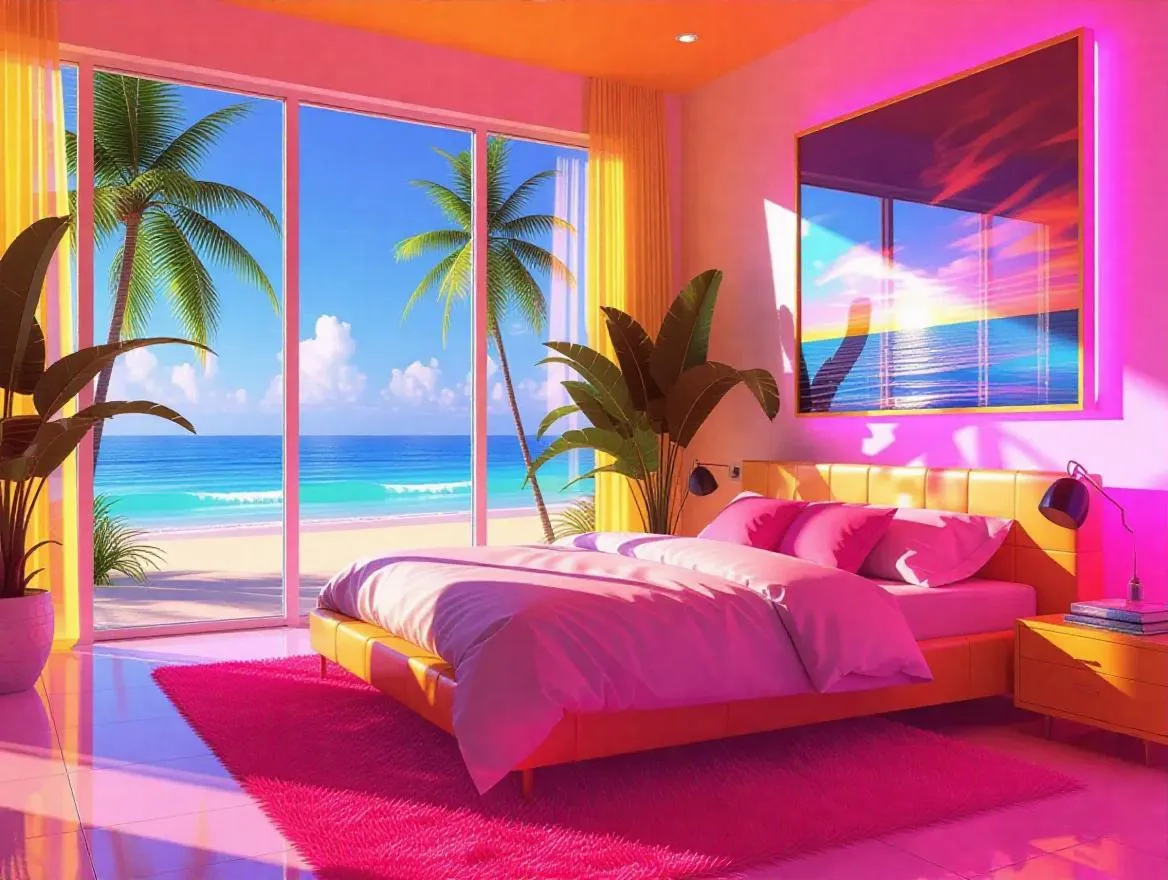 Generate vibrant GTA Vice City-style visuals with AI: 80s Miami vibe, neon aesthetics, sunlit bedroom interiors, tropical beach views. Create retro gaming nostalgia using vivago.ai's AI image tools & effects for dynamic, daylight-drenched scenes.