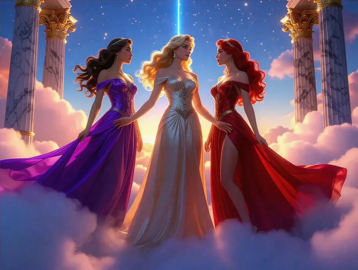 Three majestic Olympian goddesses—brunette, blonde, and redhead—adorned in elaborate, flowing gowns, exuding divine beauty. Positioned atop the ethereal clouds of Olympus, the scene is captured in cinematic grandeur, with a backdrop of shimmering celestial lights and majestic marble columns.