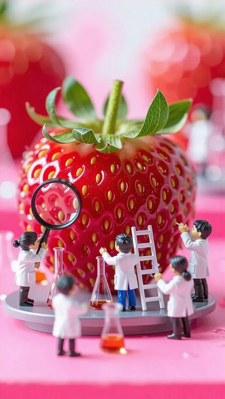 Generate whimsical AI visuals of miniature scientists in lab coats analyzing a colossal strawberry with magnifying glasses, droppers, and lab tools. Vivago.ai crafts hyper-detailed, playful scenes blending science and creativity for professional-grade AI art, animations, or videos.