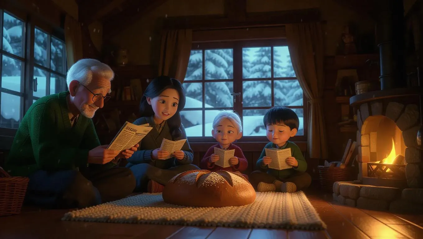 Anime family gathered in a cozy hut, the mother kneading bread by the fireplace, the father engrossed in a newspaper, the grandmother knitting a warm wool blanket, three children sleeping peacefully on a futon, rain pattering on the roof, windows gently opening and closing from the cold breeze.