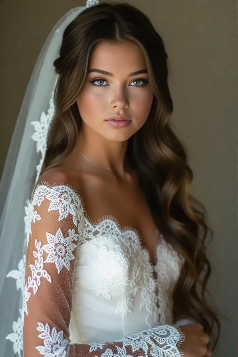 A tween boy dressed as a blushing bride, wearing an elegant wedding dress, long girly hairstyle, false eyelashes, eyeliner, mascara, flawless makeup, red lipstick, white lace arm sleeves, white open-toe strappy wedges, medium-length brown hair, long lashes, exuding a mix of innocence and charm.