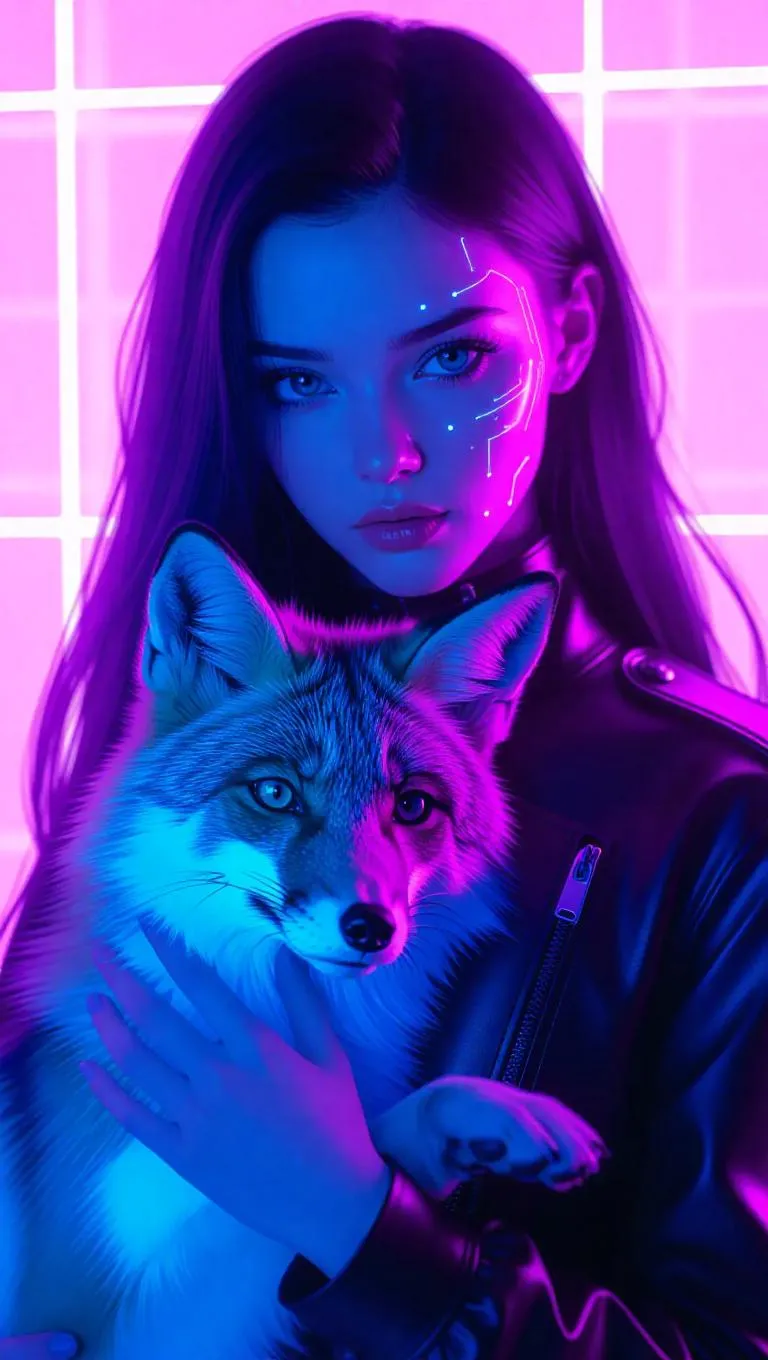 hdistyle, art illustration,1girl, android girl, holding a robotic fox, neon circuitry, deep cyber blue and purple lighting, futuristic pet bonding, holographic interface overlay masterpiece, best quality, amazing quality, very aesthetic, absurdres, detailed eyes, newest, pinkneoncybercore,