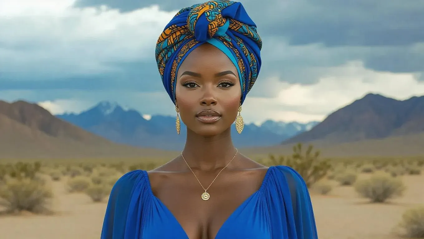 A dark-skinned black woman, 25 years old, adorned with a vibrant headscarf, gold earrings, and a delicate necklace, wearing a flowing blue dress, standing confidently in a vast desert landscape with majestic mountains and a dramatic, cloudy sky, exuding resilience and grace.