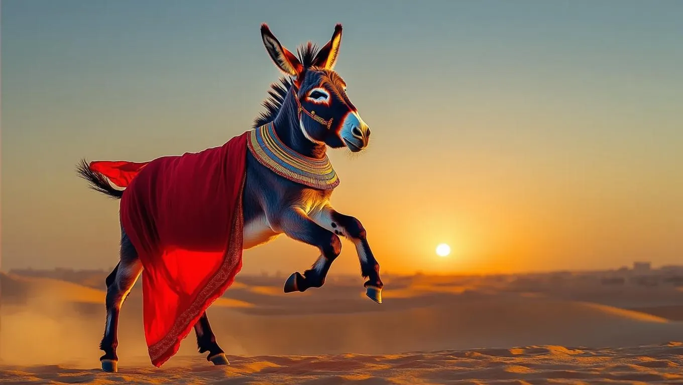 Generate vibrant AI visuals of a donkey in red attire performing Egyptian dance moves with vivago.ai. Transform text prompts into dynamic, professional-grade images using advanced AI tools for creative storytelling and unique digital content.