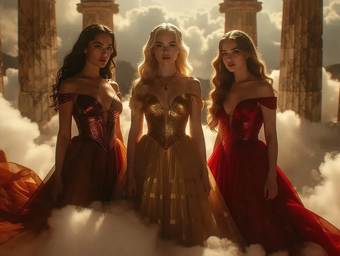 Three majestic Olympian goddesses—brunette, blonde, and redhead—adorned in elaborate, flowing gowns, exuding divine beauty. Positioned atop the ethereal clouds of Olympus, the scene is captured in cinematic grandeur, with a backdrop of shimmering celestial lights and majestic marble columns.